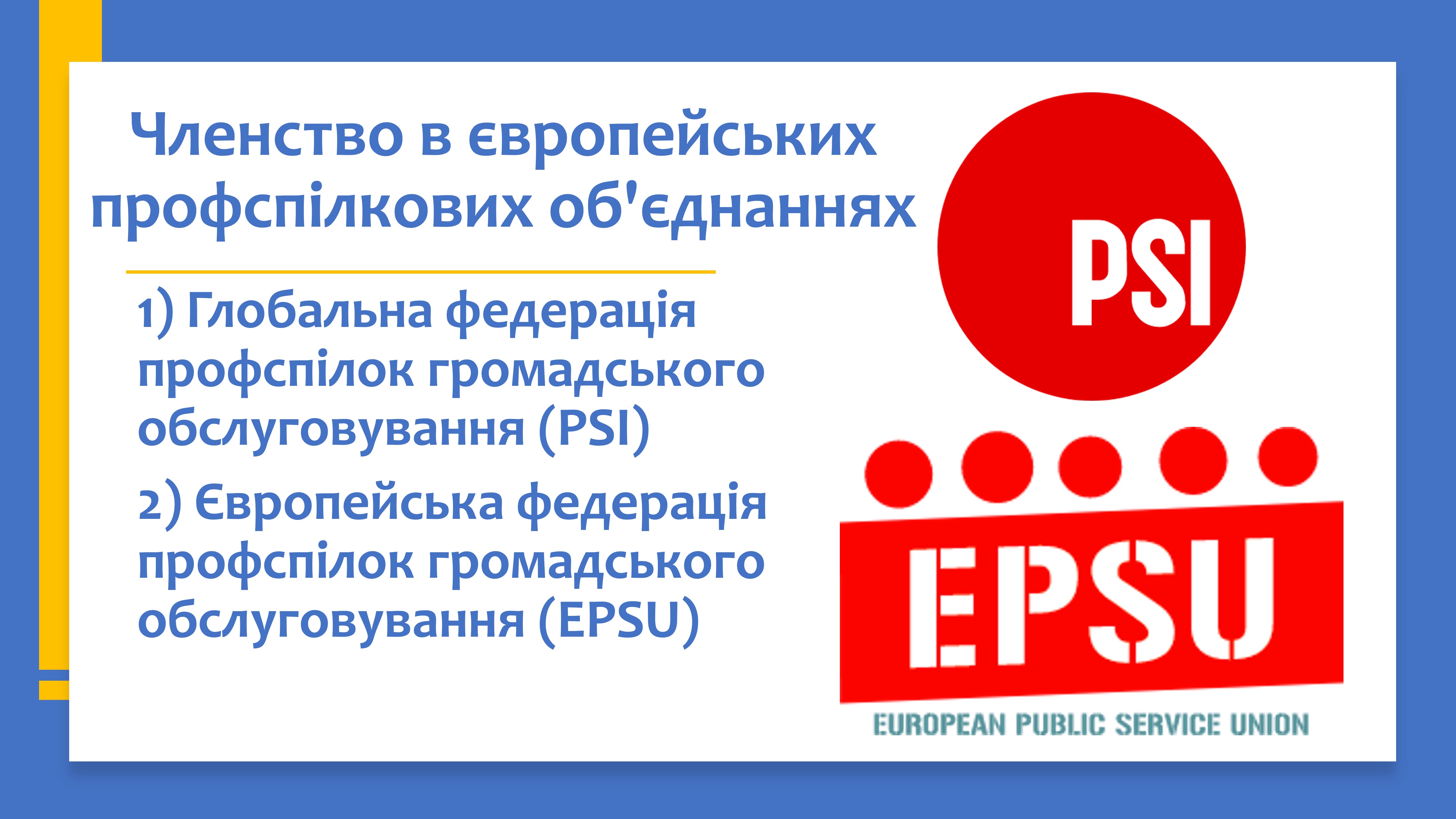 - Профспілка є членом глобальної федерації профспілок – Інтернаціоналу громадського обслуговування (PSI) та Європейської федерації профспілок громадського обслуговування (EPSU);